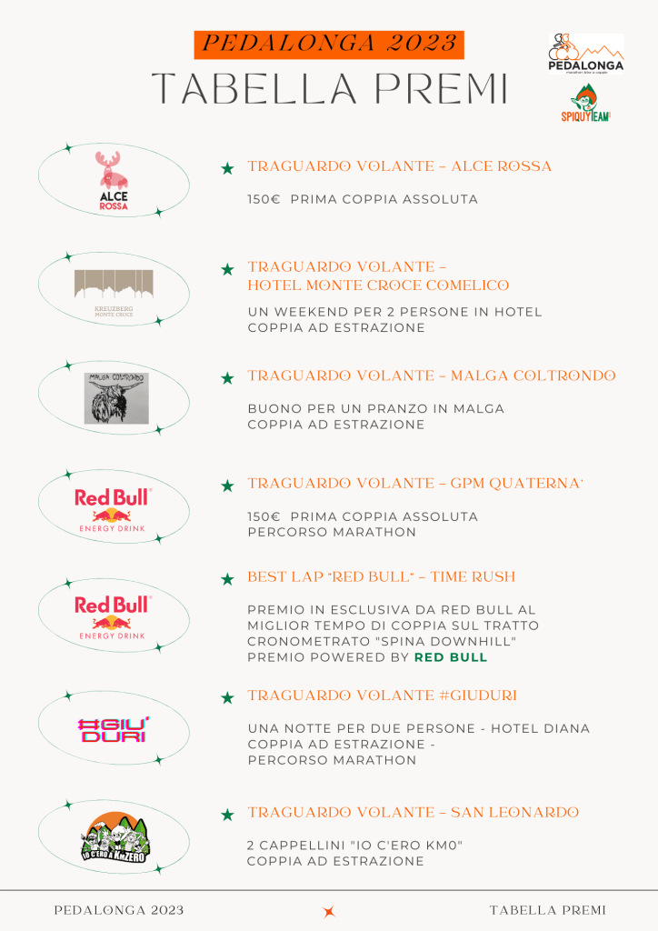L’A.S.D. Spiquy Team è lieta di annunciare il supporto di Red Bull per la Pedalonga 2023. Per la sua 13a edizione la gara ha ottenuto il patrocinio della Fondazione Dolomiti Dolomiten Dolomites Dolomitis UNESCO. Time Rush Red Bull e ben 7 traguardi volanti offriranno tanti premi aggiuntivi!